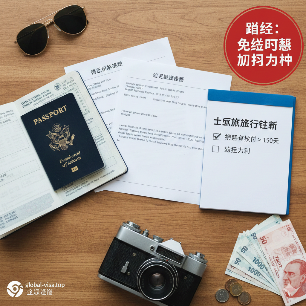 150 Days'。周围点缀着太阳镜、相机和少许土耳其里拉现金。色调温暖,总结了文章强调的'虽免签但需准备辅助文件'的核心建议。”>