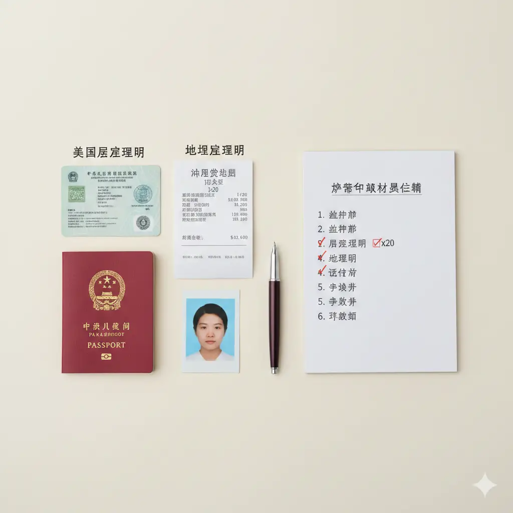 一张展示办证材料清单的功能性图片。画面采用干净的办公桌面风格,上面摆放着中国护照、美国绿卡、I-20表格、专业证件照以及一支质感钢笔。侧边以优雅的UI卡片形式列出‘换发、补发、未成年人’三个分类。色彩明亮,光线柔和,文字指引清晰,给用户整洁有序的视觉感受。